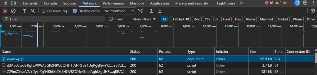 - Spójrz na kolumnę „Size”. Interesuje Cię wartość przesłana (transfer) oraz wielkość zasobu (resource). Obie będą niemal na pewno w kilobajtach (kB).