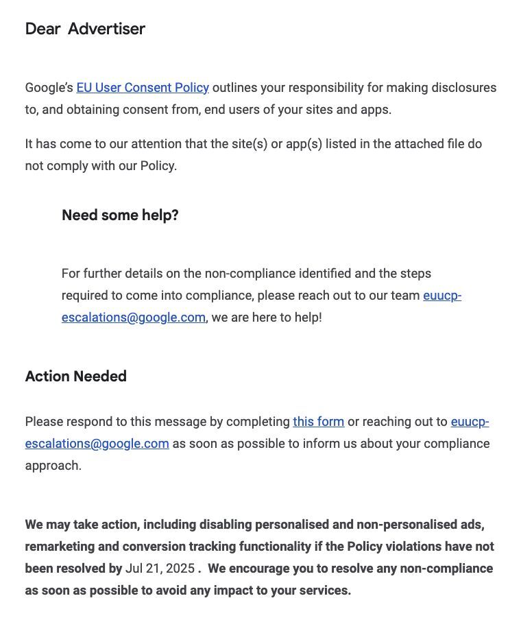 Możemy podjąć działania, włączając w to wyłączenie spersonalizowanych i niespersonalizowanych reklam, funkcji remarketingu oraz śledzenia konwersji, jeśli naruszenia Zasad nie zostaną rozwiązane do 21 lipca 2025 r. Zachęcamy do jak najszybszego rozwiązania wszelkich problemów z niezgodnością, aby uniknąć wpływu na Twoje usługi.