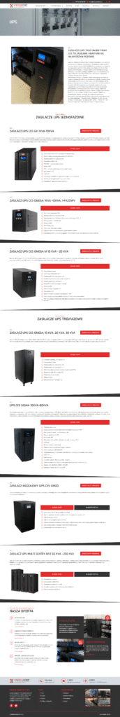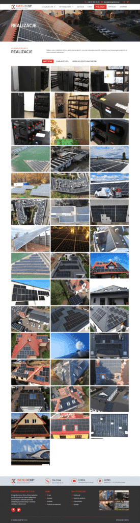 Strona zawiera przejrzystą prezentację oferty, w tym szczegółowe informacje o produktach takich jak zasilacze UPS. W sekcji „Realizacje” wdrożona jest galeria zdjęć z zakończonych projektów, co pozwala klientom zapoznać się z efektami pracy firmy. Projekt uwzględnia prostą nawigację, nowoczesny design oraz optymalizację pod kątem SEO.