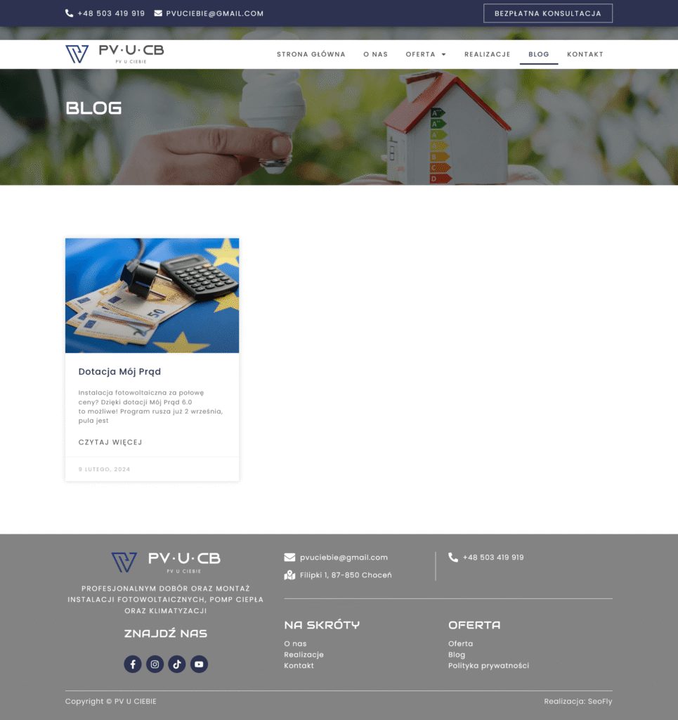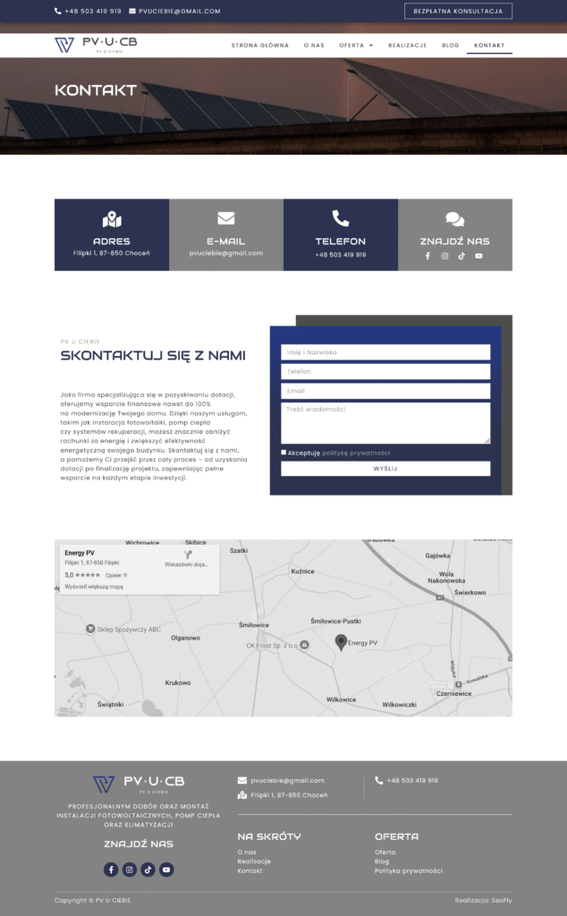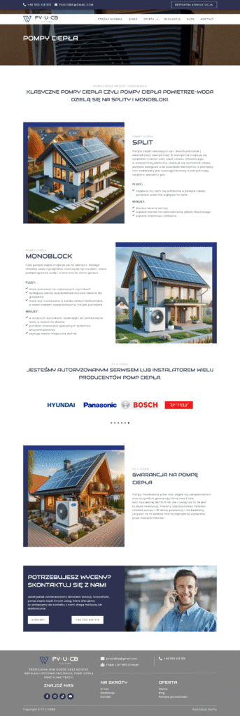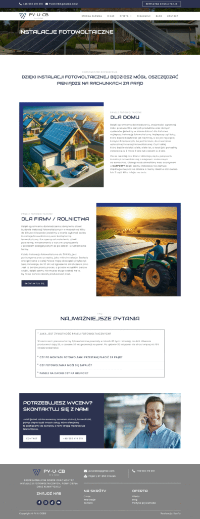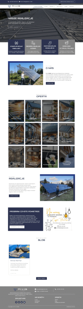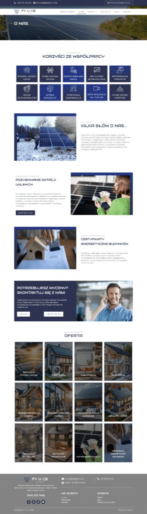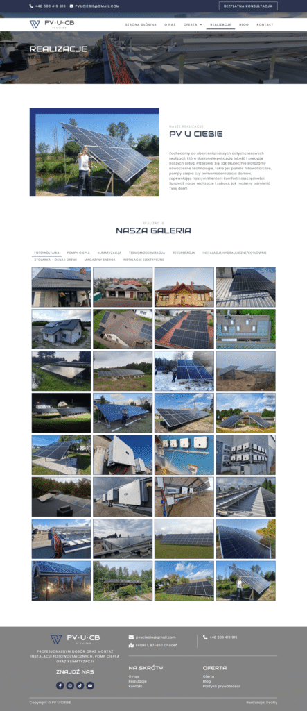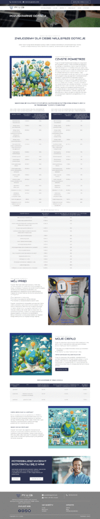 Stworzyliśmy nowoczesną stronę internetową na platformie WordPress, opartą na naszym autorskim szablonie demo, dla firmy oferującej kompleksowe usługi w zakresie instalacji paneli fotowoltaicznych, pomp ciepła, systemów klimatyzacji i rekuperacji, a także stolarki drzwiowej i okiennej. Strona została zaprojektowana z myślą o czytelnej prezentacji oferty oraz łatwej nawigacji dla użytkownika.